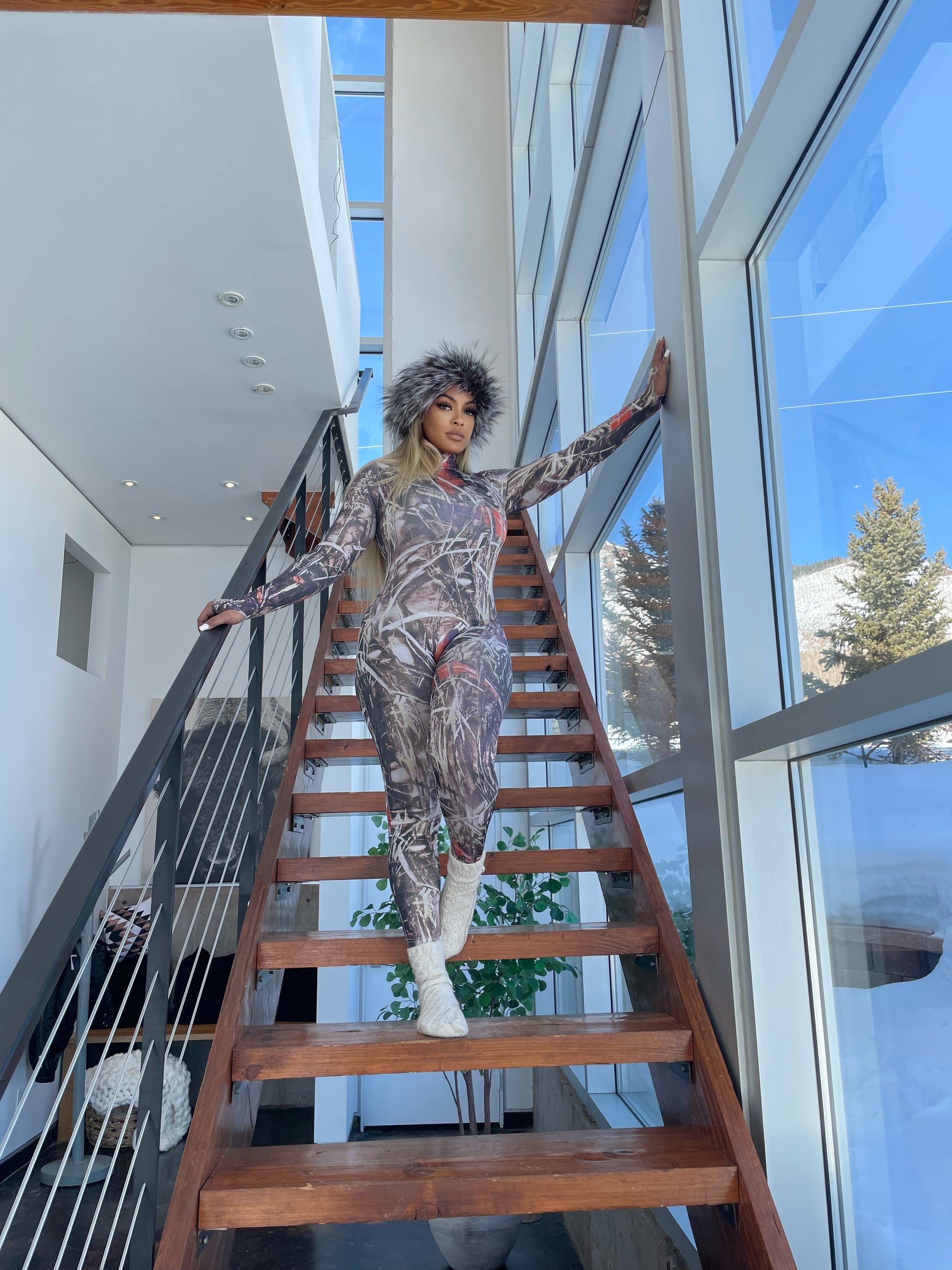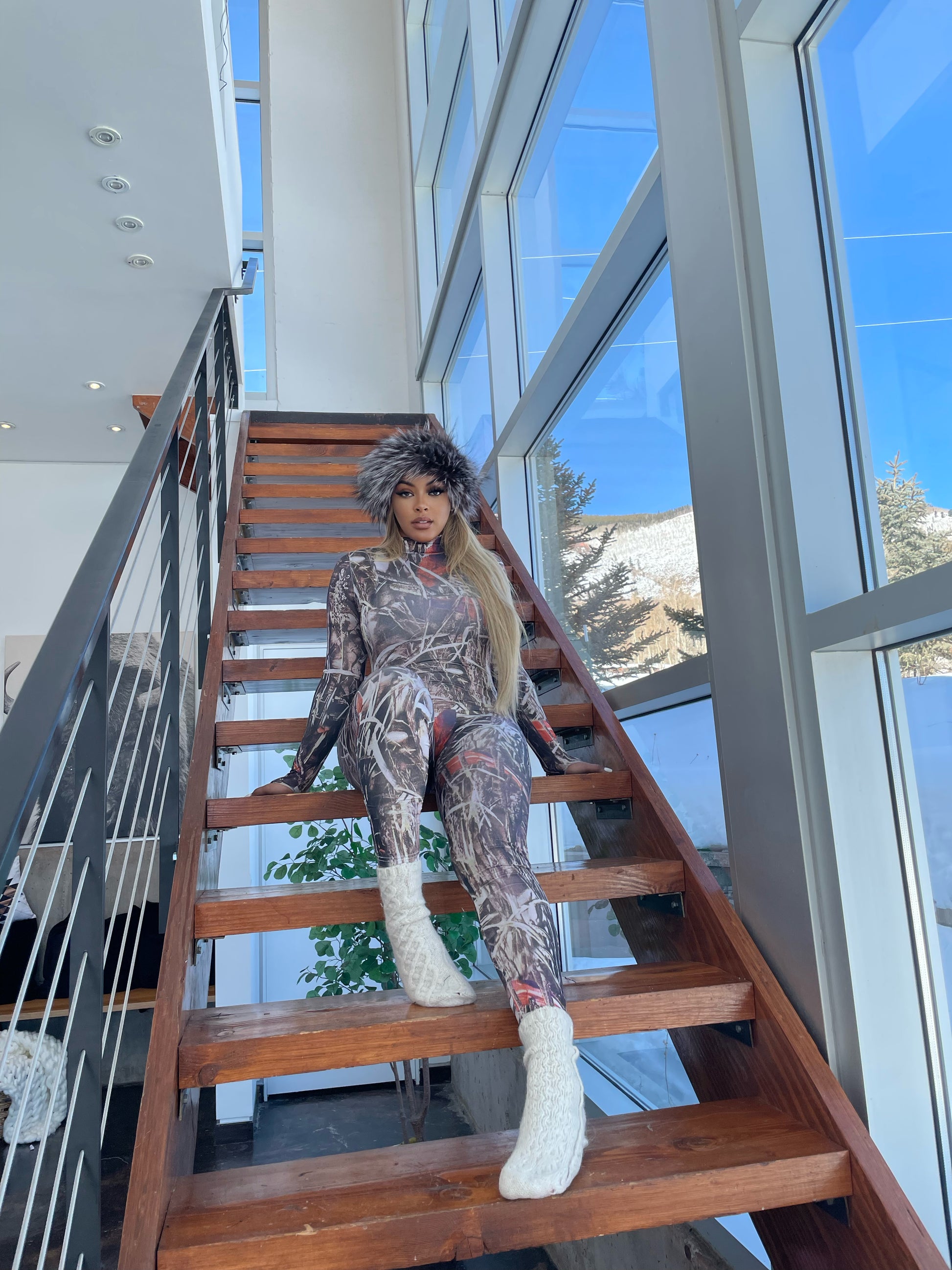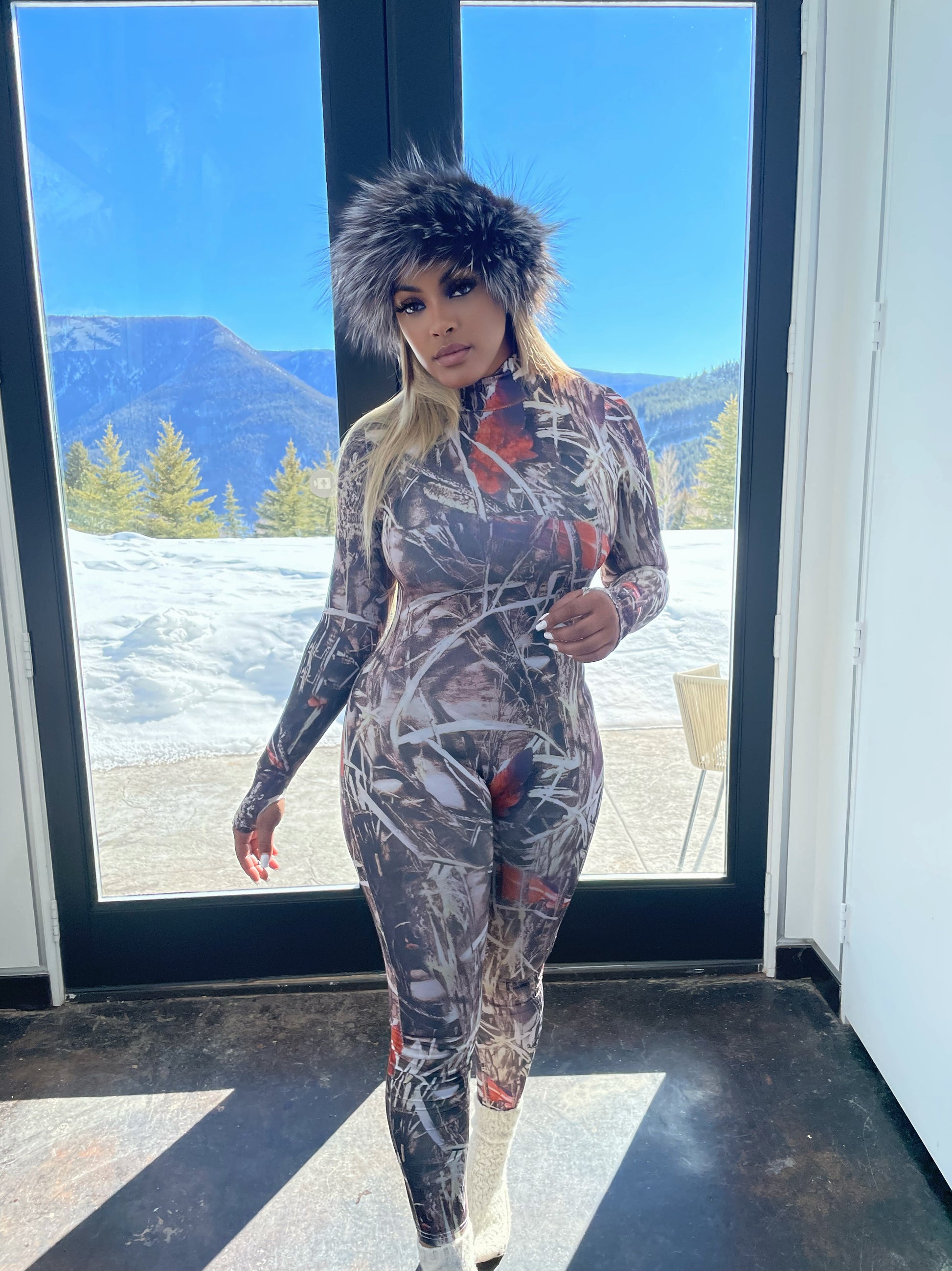 Stylish Tree Branch Print Mock Neck Fitted Long Sleeve Jumpsuit