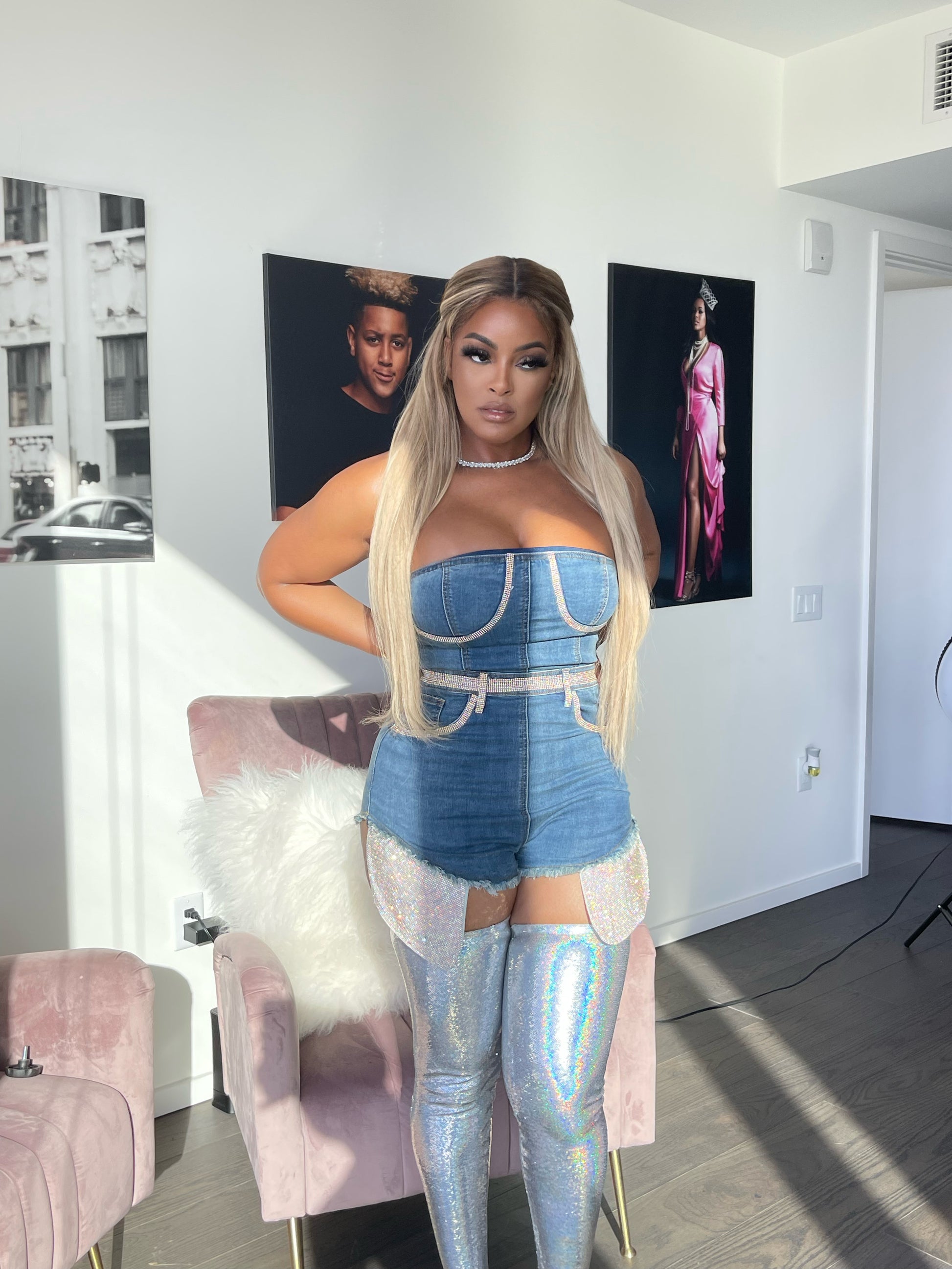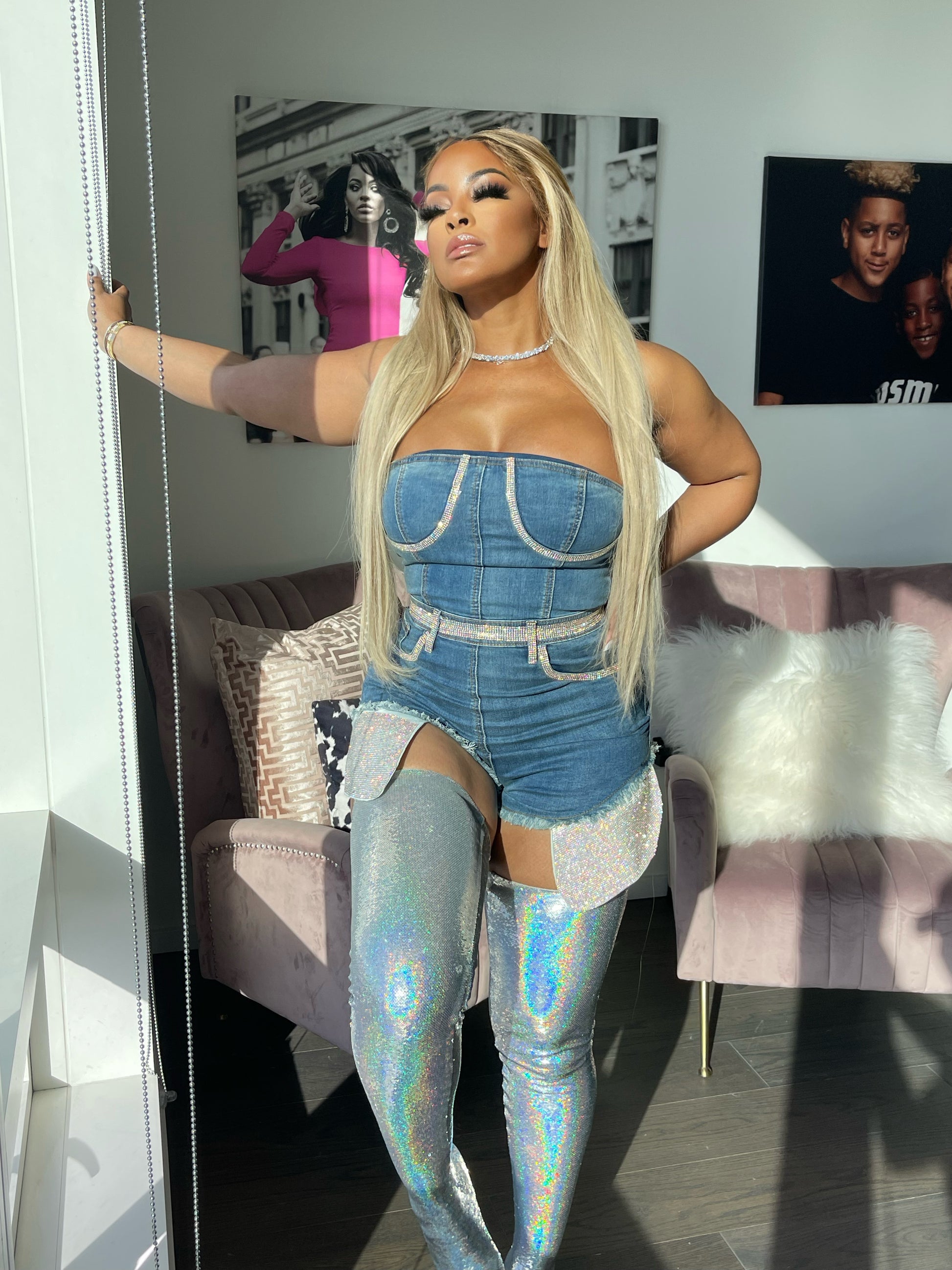 Jean short jumpsuit with bling out details. 71% cotton, 28% polyester 1% spandex