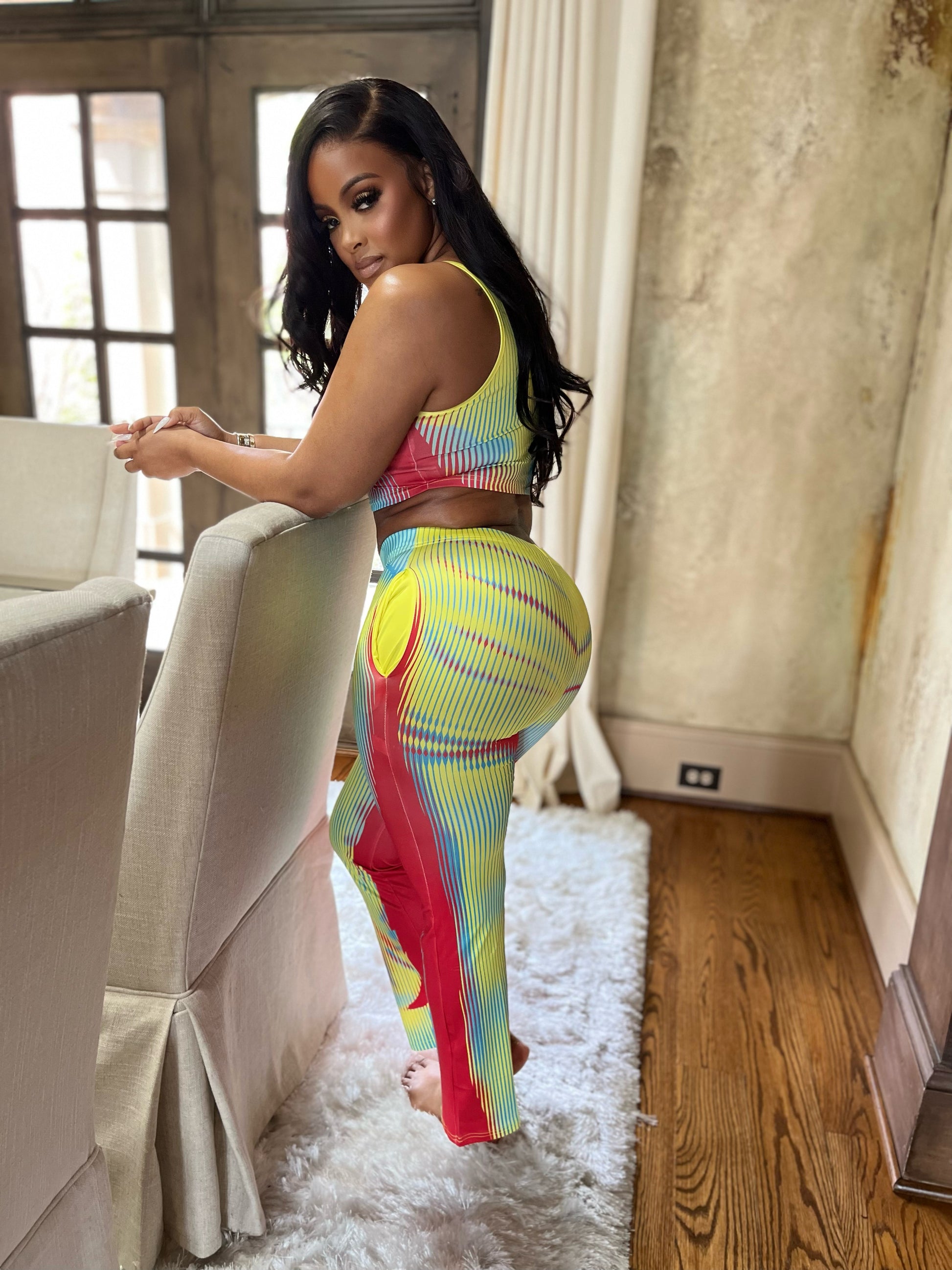 Graphic body image, printed tank top, and casual pants set.