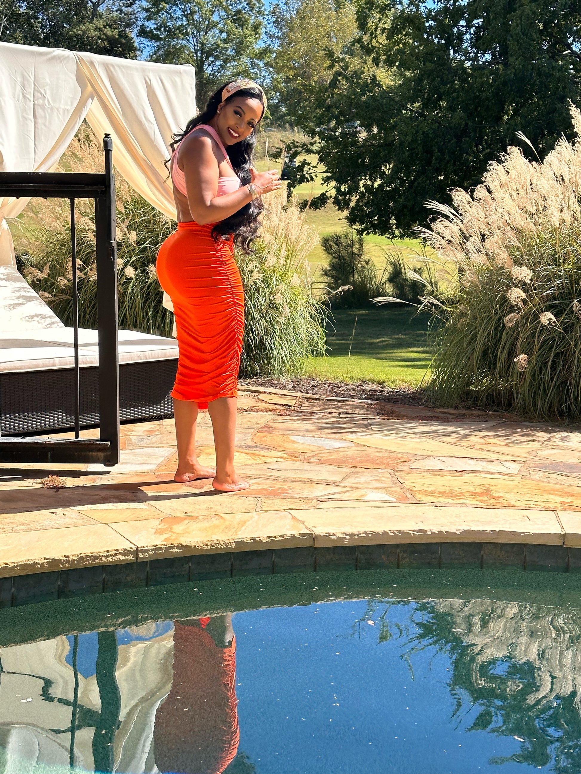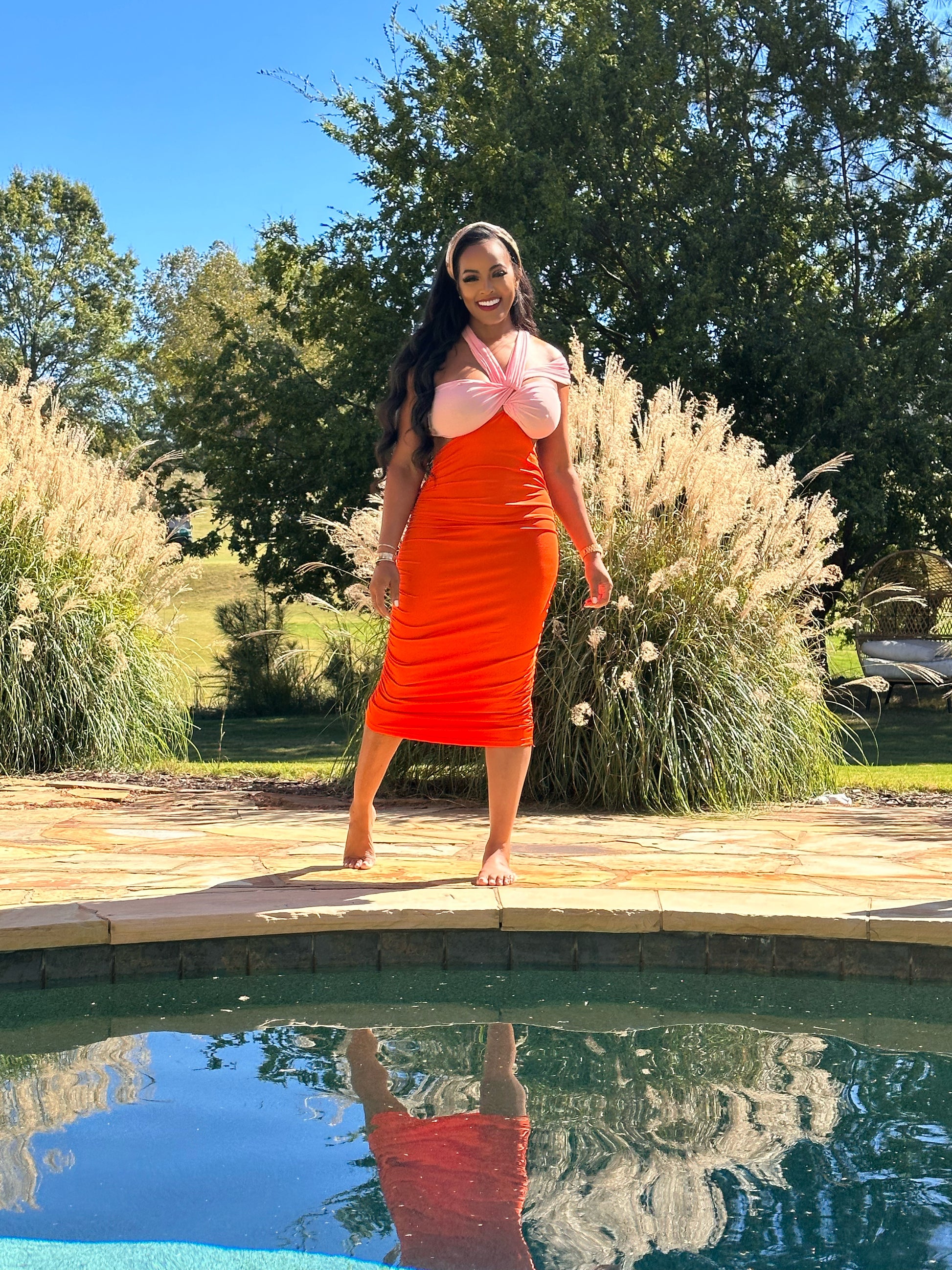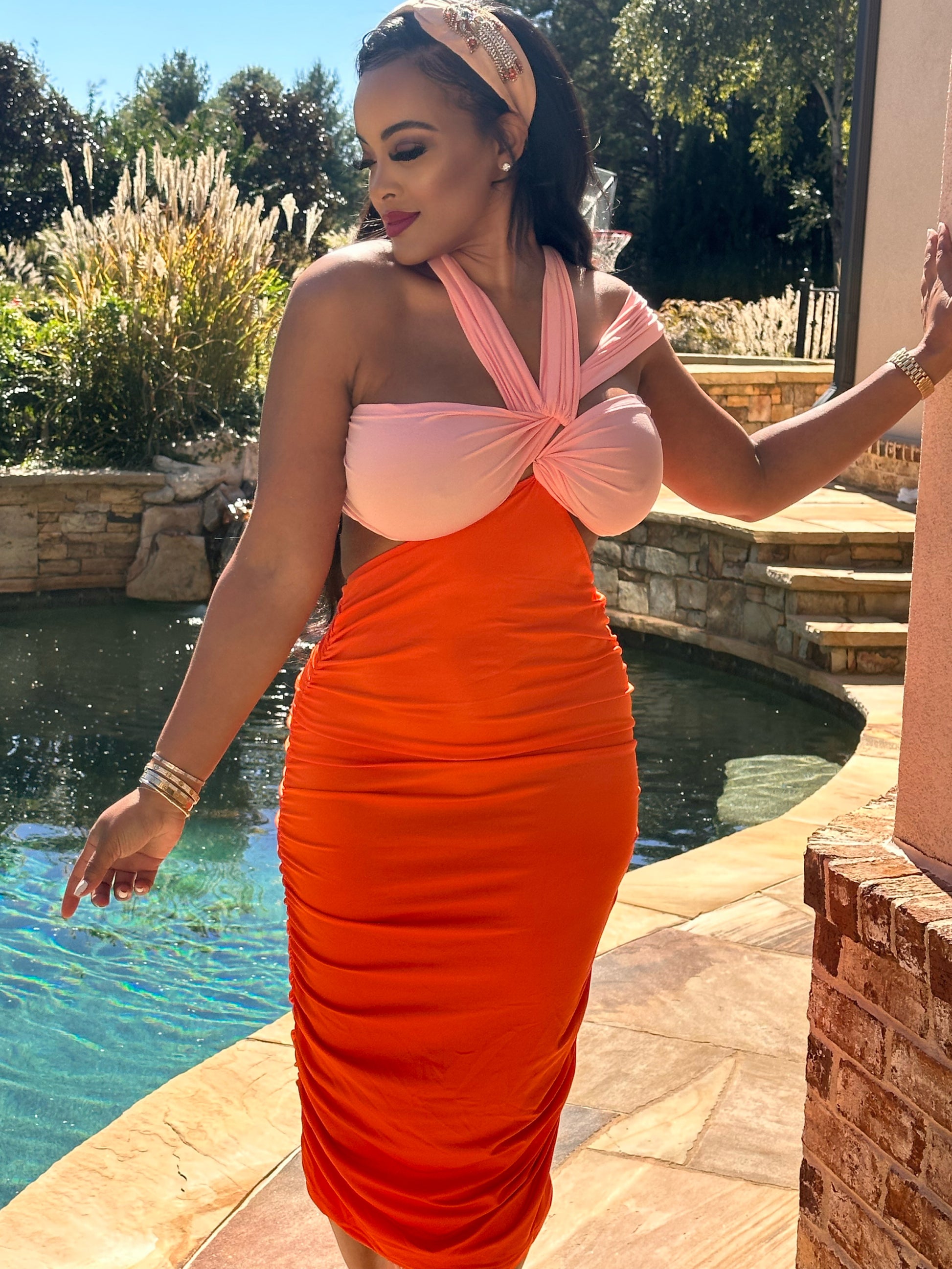 Light pink & orange scrunch, stretch dress with multiple wrap top.